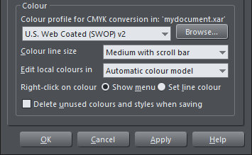 To embed a custom profile click Browse and select a custom ICC profile. This profile is then embedded and saved in the document. If you move the XAR project file to another PC, it will still contain and use the custom profile.