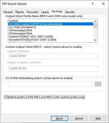 For standard PDFs (Draft / Web / High Quality preset options), a color profile is, by default, not selected or embedded. If you wish to do so, change the color model to CMYK in the General tab. This will allow you to set a color profile (and will default to what is set within the View tab).
