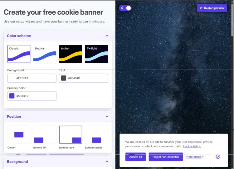 Add a cookie consent message to your website. Configure the banner position, layout, color, and message to inform visitors that your website uses cookies.
