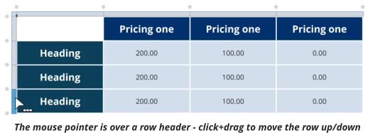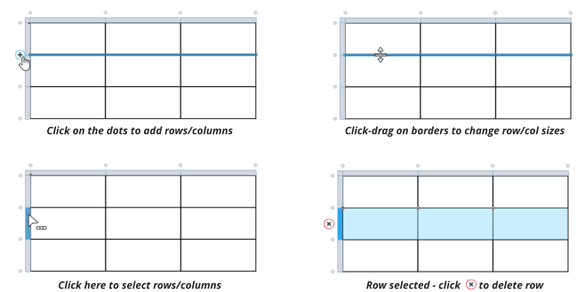 Using these controls you can quickly add rows and columns, change row and column sizes, select and delete rows and columns, all directly on the table without using the InfoBar. Use Ctrl+click or Shift+click on the row and column headers to select multiple rows/columns. Backspace will also delete a selected row or column (whereas Delete will delete the contents).