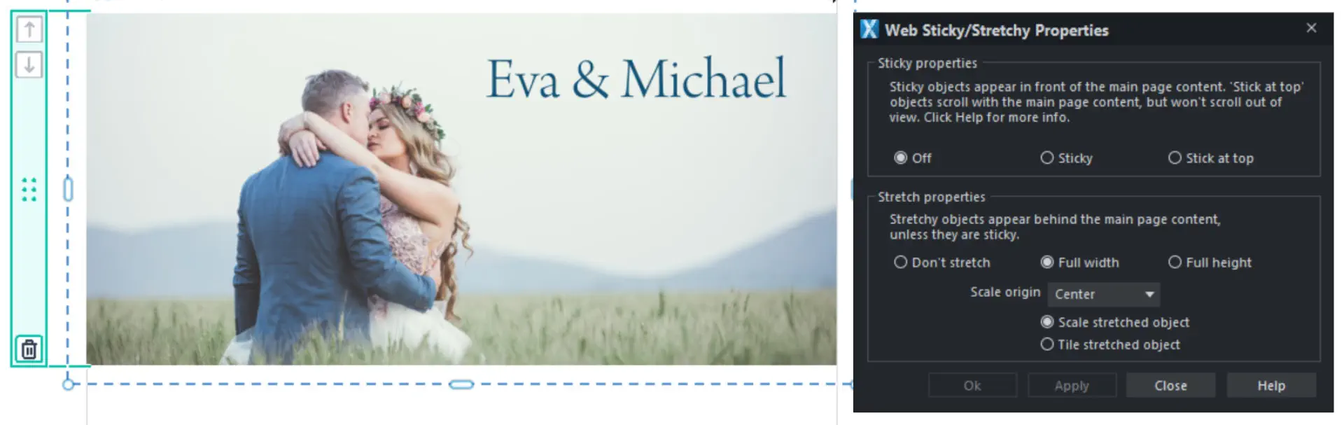 Full width settings can be enabled for a slider from the Slider Options dialog or Web Sticky/ Stretchy Properties dialog. Enabling full width on a slider will stretch items which have a width of 95% or more of the slider. Text is excluded from this rule.